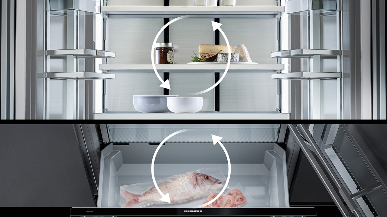 DuoCooling technology uses two completely separate refrigeration circuits to prevent air from being exchanged between the fridge and freezer compartments. This protects food in the refrigerator compartment from dry air from the freezer compartment. Also, odours do not mingle and the foods retain their own aroma. There is no air exchange between the fridge and freezer compartments, odour transfer is prevented and stored food does not dry out.