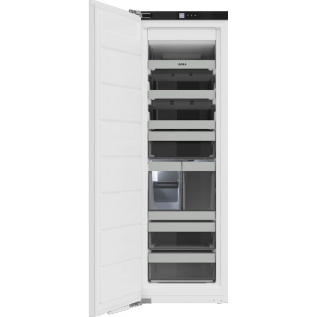 The Bora F178GWS2 is a fully integrated upright freezer offering 213 litres of frost-free storage. With a left-hand hinged reversible door, intuitive LED display, and user-friendly interface, it’s designed for convenience. It includes 8 drawers, 3 glass pull-out shelves, and a built-in ice maker with a mains water connection. Features such as auto defrost, BORA Connect, Eco Mode, and visual and audible temperature alerts ensure efficient and reliable performance. Rated E for energy efficiency and operating at just 33 dB, it’s a quiet and practical addition to any kitchen.